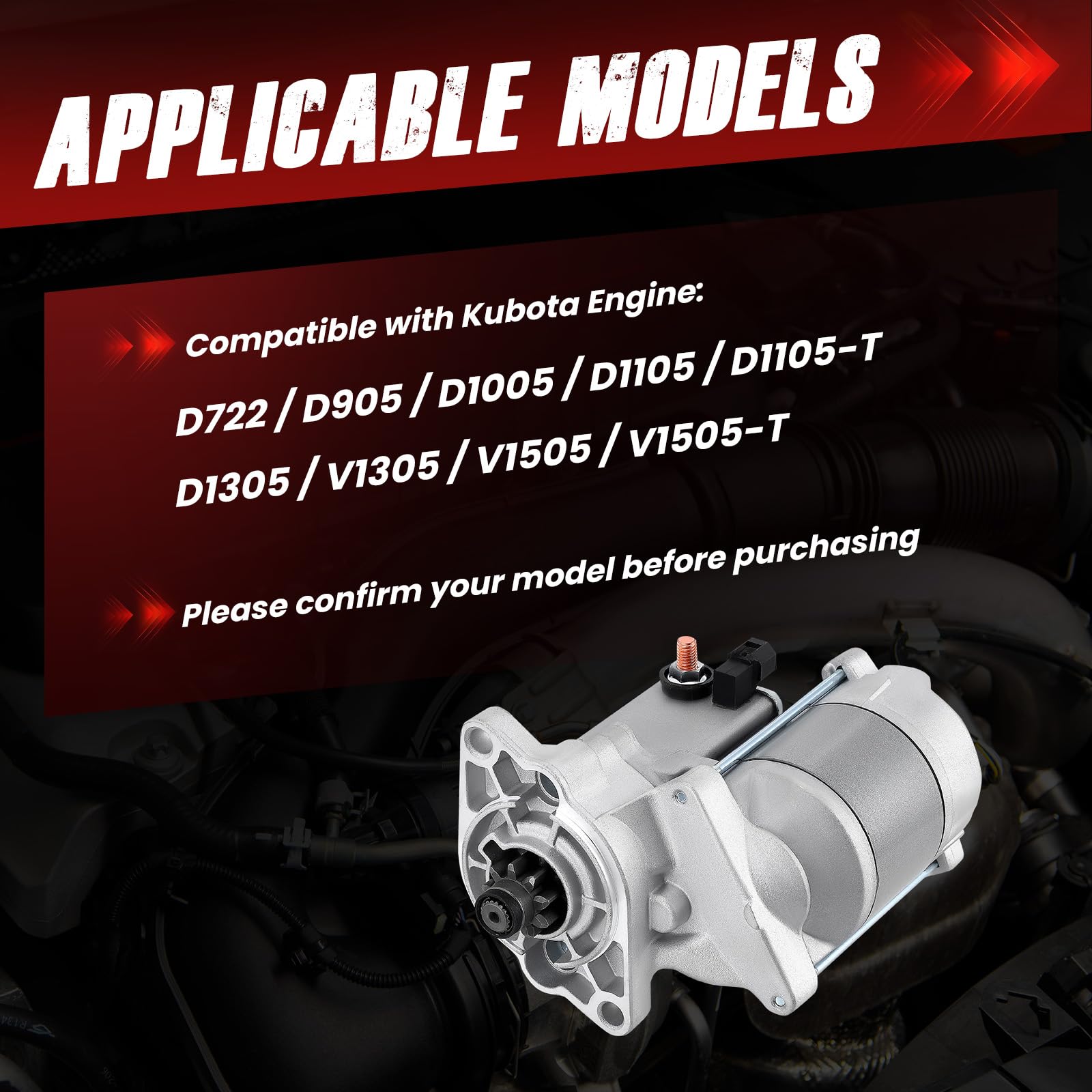 - [Direct Fitment]: 16614-63010 Starter Motor Compatible with Kubota Engine D722 D905 D1005 D1105 D1105-T D1305 V1305 V1505 V1505-T; Compatible with Kubota Excavator K-008
